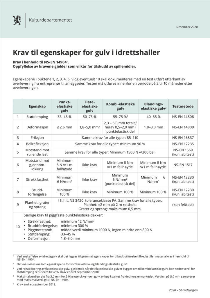 Oppdaterte krav til egenskaper for sportsgulv i gymsaler og idrettshaller finnes også i Krav til egenskaper for gulv til idrettshaller (Kulturdepartementet, 2020).